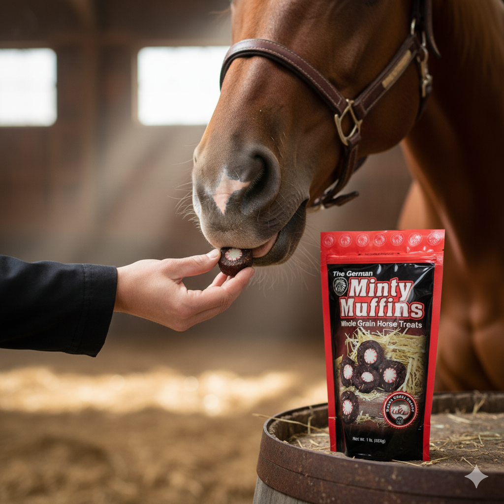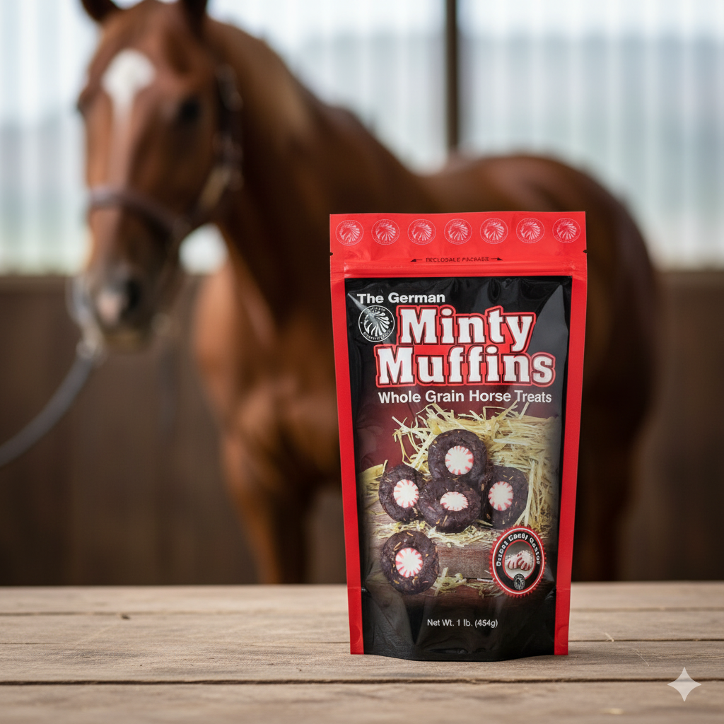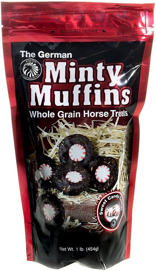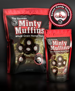 German Minty Muffins are premium horse treats featuring a sweet, minty center. This 1 lb ziplock pouch contains sweet and chewy treats made from fresh, all-natural ingredients including sweet feed and molasses. Authentic German recipe perfected in the USA. A decadent indulgence your horse will love.