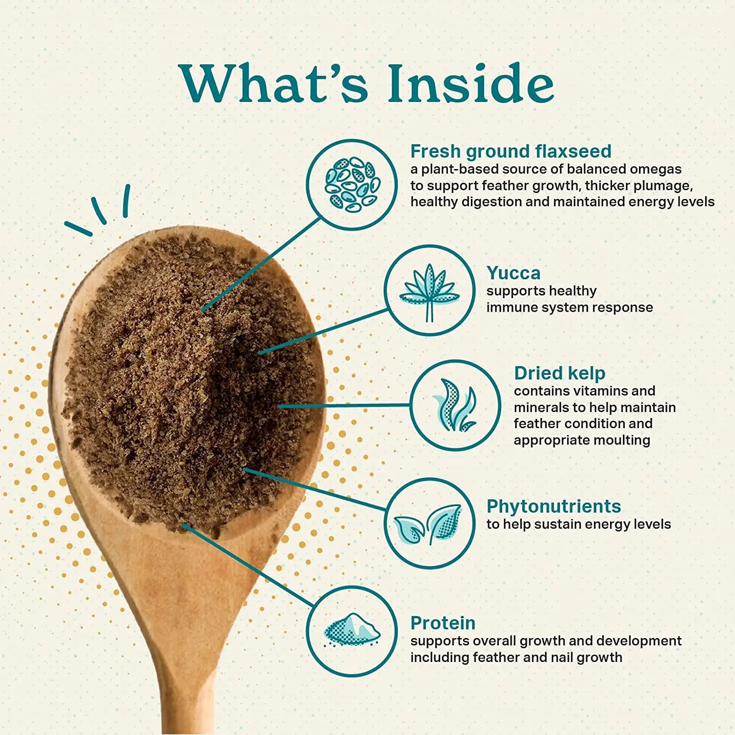 This powder supplement was created to help captive birds thrive. Perfect for molting and feather-picking birds to support their energy and digestion while helping keep their plumage healthy and beautiful.